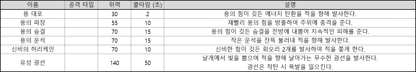 | 용 | 용 속성으로 이루어진 액티브 스킬 피격 시 화상을 발생시킬 수 있다. |