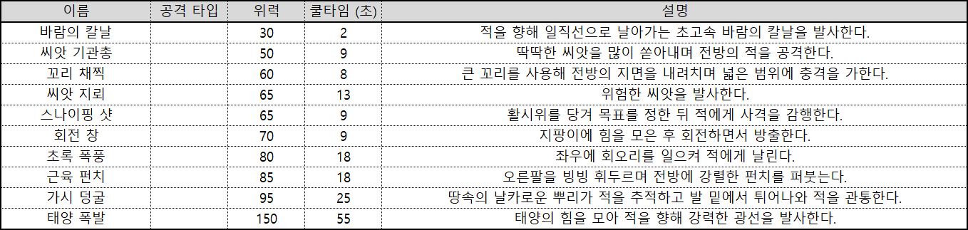 | 풀 | 풀 속성으로 이루어진 액티브 스킬 피격 시 속박을 발생시킬 수 있다. |