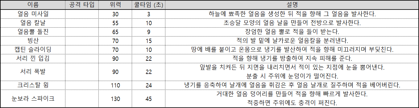 얼음 속성 관련 액티브 스킬은 아래와 같다.