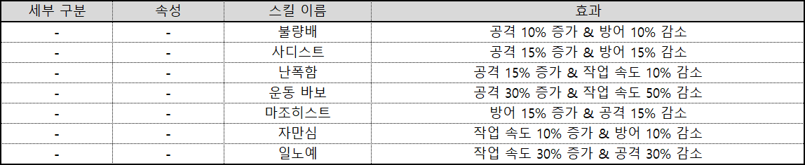 | 특수 | 특수한 수치를 증가시키는 패시브 스킬이다. 해당 항목에 부정적인 영향을 가진 스킬 없다. |