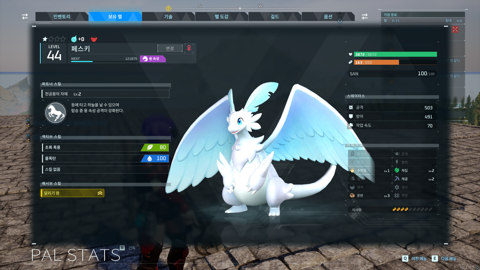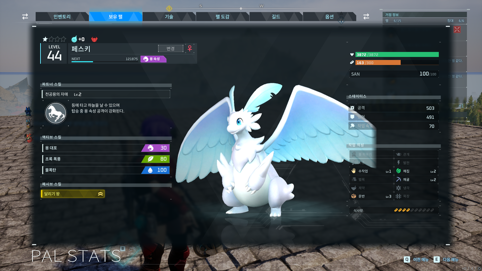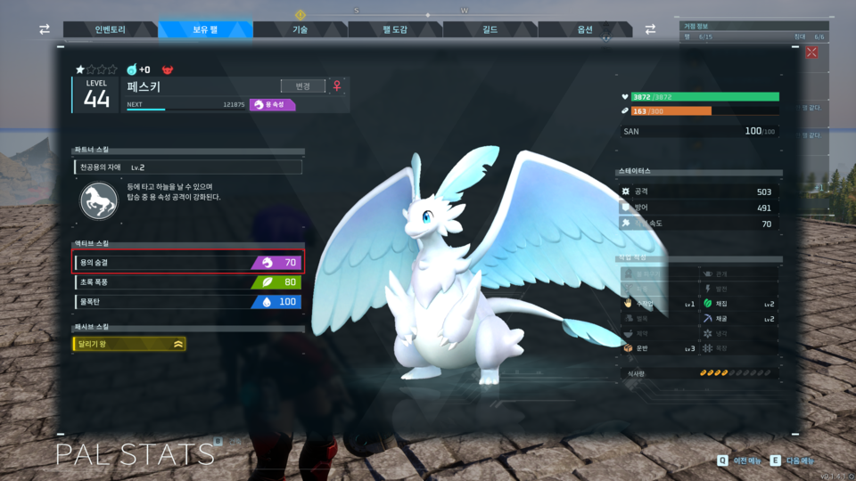 : 아래와 같이 선택된 팰의 정보창으로 화면이 전환된다.