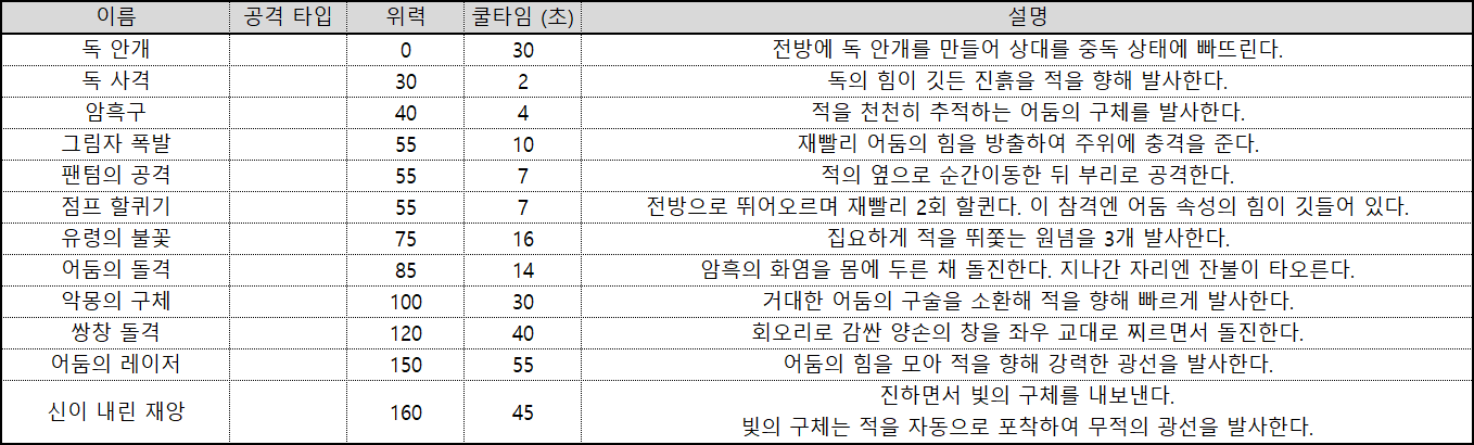 어둠 속성 관련 액티브 스킬은 아래와 같다.