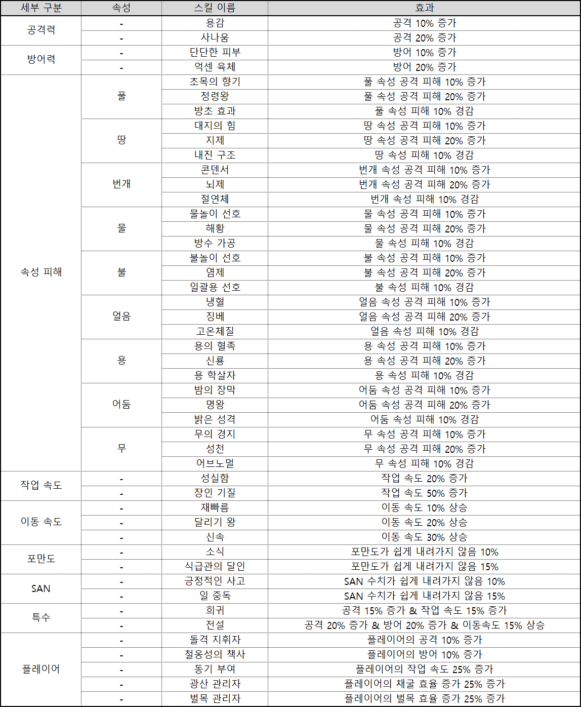 | 속성 피해 | 속성 피해를 증가 또는 감소시키는 패시브 스킬이다. |