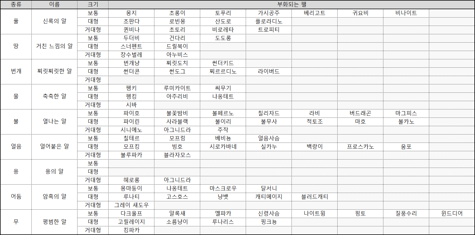 부화에 따라 획득하는 팰은 알의 종류와 크기에 따라 아래와 같이 나타난다.