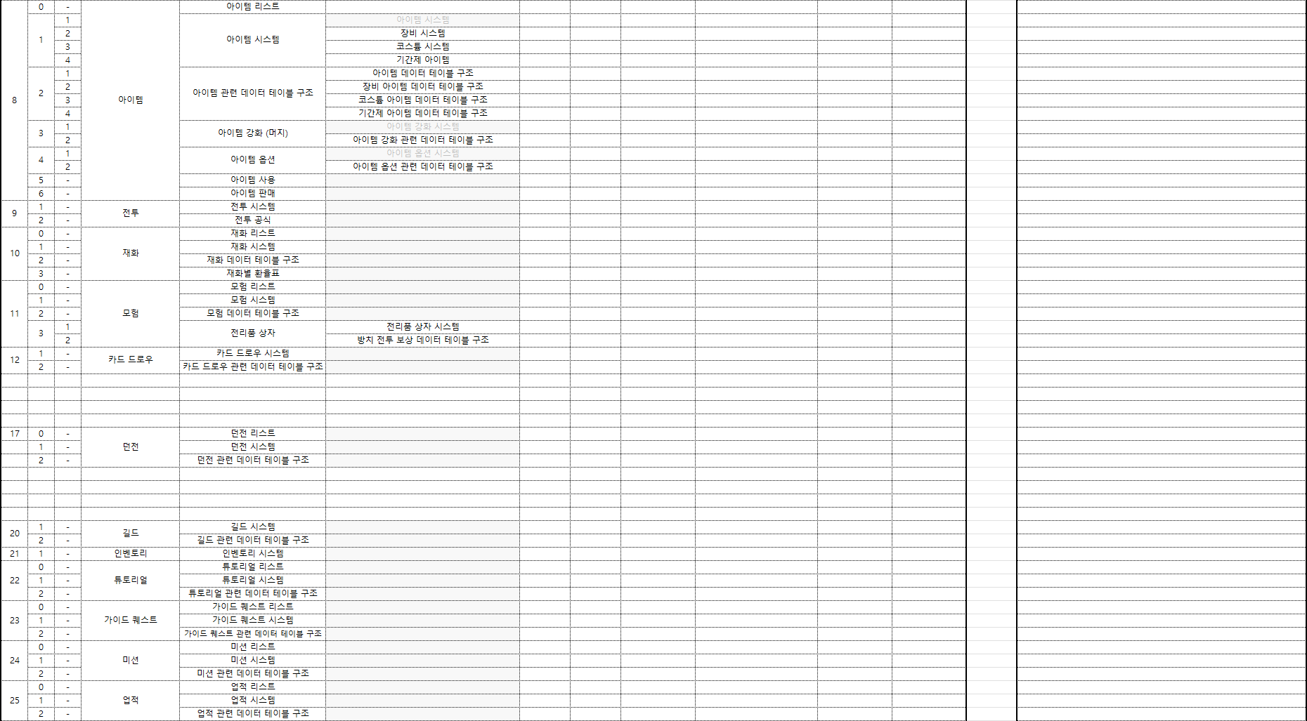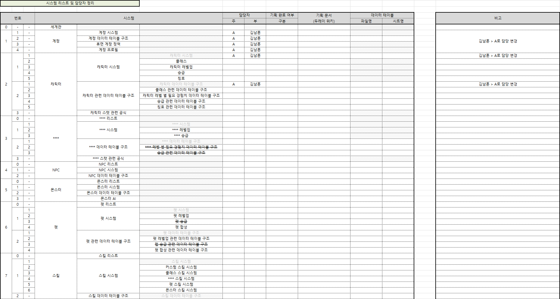 해당 프로젝트에 존재하는 시스템들은 무엇인지 정리하며 각각의 시스템들에 대한 담당자, 기획 완료 여부,