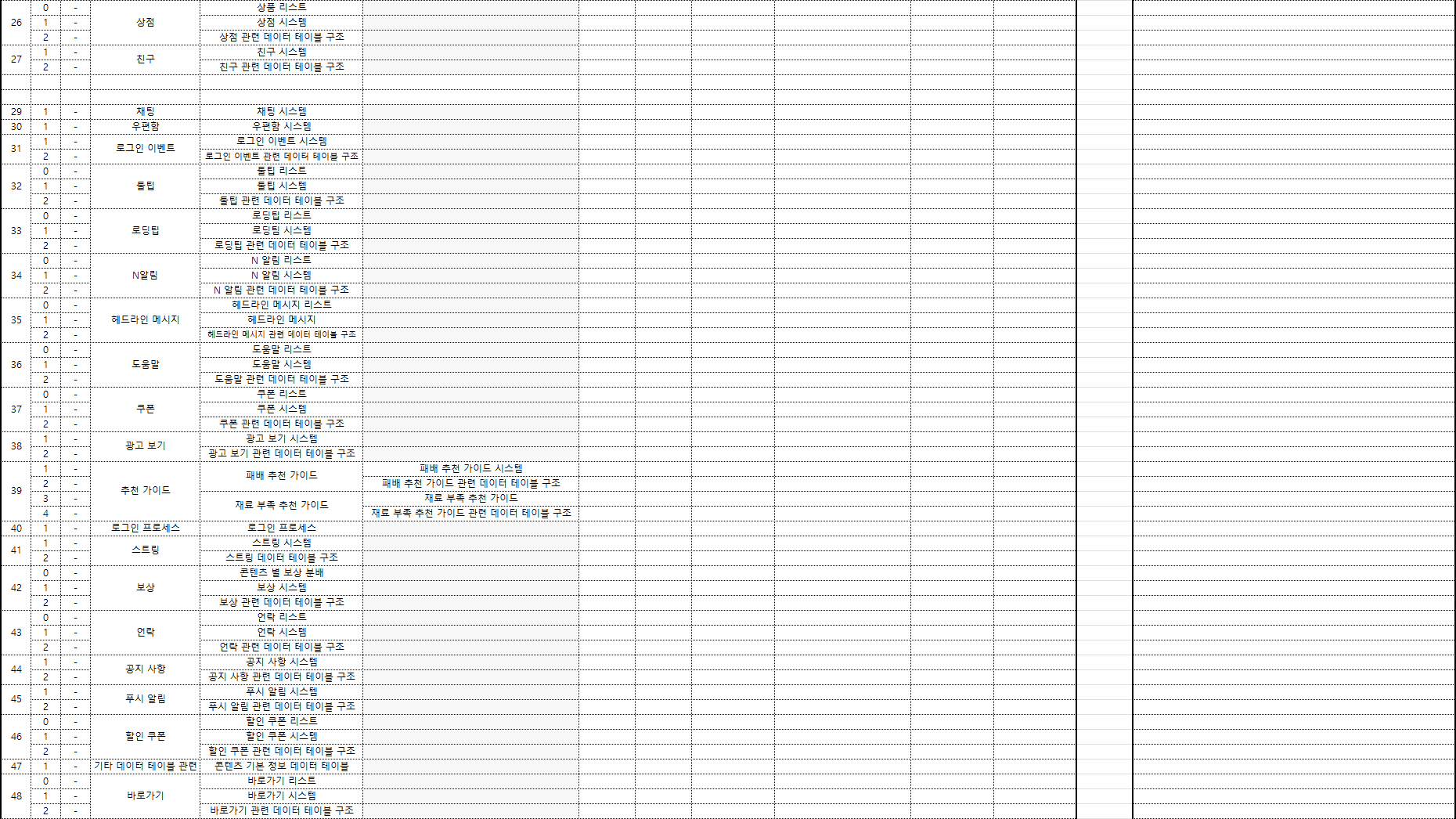이미지이다보니 기획문서란과 데이터 테이블 관련 란을 좀 줄였는데도... 한번에 보이긴 어렵네요.